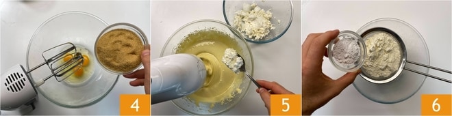 Battez les œufs avec un batteur électrique à vitesse moyenne-élevée en ajoutant peu à peu le sucre 4, cela prendra environ 10 minutes. Une fois que vous avez obtenu un mélange clair et mousseux, incorporez la ricotta, une cuillère à la fois 5. Tamisez à part la farine et la levure 6,