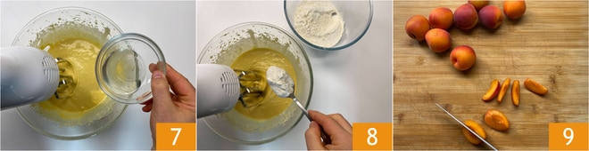 Incorporez l'huile en filet 7, puis ajoutez les ingrédients secs petit à petit dans la pâte, en gardant le batteur à basse vitesse 8. Lavez et séchez les abricots : 4 seront utilisés pour la décoration, coupez-les en 12 tranches au total 9.
