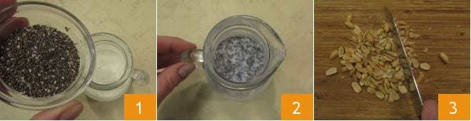 Pour réaliser le gâteau aux bananes et cacahuètes, commencez par faire tremper les graines de chia dans le lait fermenté pendant 4-5 minutes (1-2). Pendant ce temps, hachez les cacahuètes avec un couteau et mettez-les de côté 3.