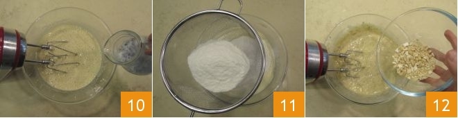 Continuez à mélanger avec le batteur et versez le lait fermenté avec les graines de chia 10. Ajoutez ensuite les poudres (les farines et la levure) en les tamisant à travers un tamis 11. Enfin, incorporez les cacahuètes hachées 12