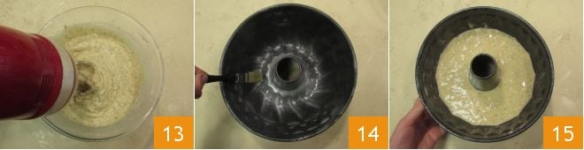 et battez encore pendant 1 minute 13. Beurrez un moule à gâteau de 22 cm de diamètre et de 10 cm de hauteur 14 et versez la pâte à l'intérieur 15.