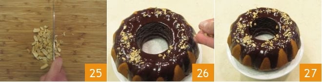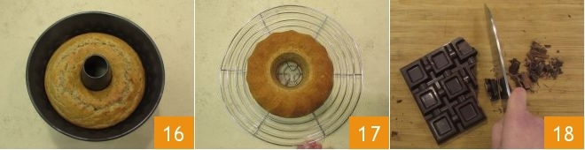 Faites cuire dans un four statique préchauffé à 180° sur le niveau moyen pendant 40 minutes. À la fin de la cuisson, sortez le gâteau 16 et laissez-le tiédir pendant quelques minutes. Ensuite, démoulez le gâteau en le retournant sur une grille 17 et laissez refroidir pendant une heure à température ambiante. Pendant ce temps, hachez finement le chocolat avec un couteau 18 et transférez-le dans un bol.