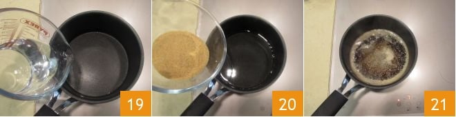 Versez dans une petite casserole l'eau 19 et le sucre 20 sans mélanger, portez à ébullition et laissez bouillir pendant environ 3-4 minutes 21.