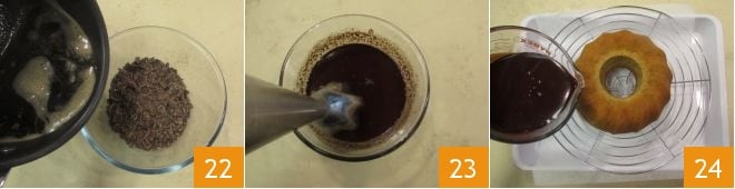 Versez le sirop obtenu sur le chocolat 22 et émulsionnez la sauce avec un mixeur plongeant en veillant à ne pas créer de bulles d'air 23, puis versez le glaçage obtenu sur le gâteau 24.
