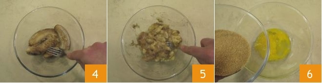 Écrasez les bananes avec une fourchette 4 pour obtenir une purée 5. Pendant ce temps, dans un bol, versez les œufs, le sucre 6