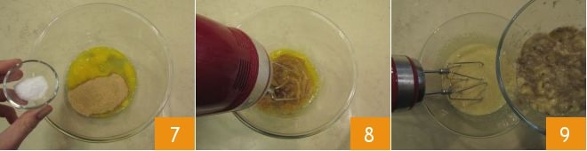 et le sel 7. Avec un batteur électrique, battez le mélange 8 jusqu'à ce qu'il soit clair, puis ajoutez également la pulpe des bananes 9.
