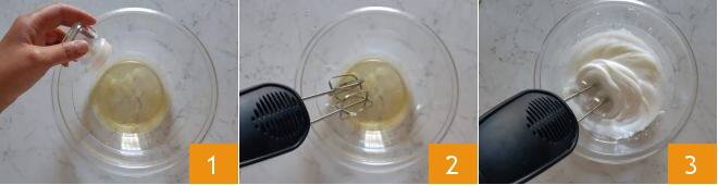 Pour préparer le gâteau aux blancs d'œufs et cacao, commencez par mettre les blancs dans un grand bol. Ajoutez une pincée de sel 1 et avec un batteur électrique, commencez à les monter 2, jusqu'à obtenir des blancs en neige ferme 3.