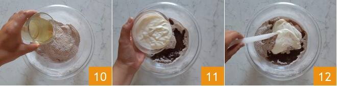 Versez l'huile 10, le yaourt 11 et mélangez avec une spatule 12