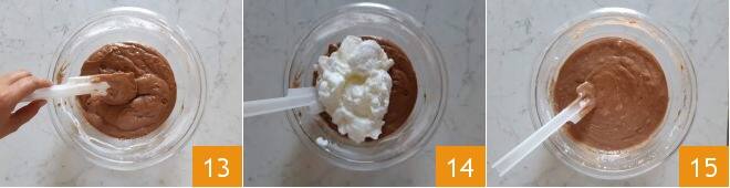 jusqu'à obtenir un mélange lisse et homogène 13. Incorporez ensuite les blancs d'œufs petit à petit 14, en mélangeant de bas en haut. Une fois terminé 15