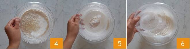 Dans un autre bol, tamisez la farine 4 et la levure 5. Ajoutez ensuite le sucre 6