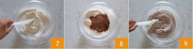 et mélangez les poudres 7. Ajoutez ensuite le cacao 8 et mélangez encore 9.
