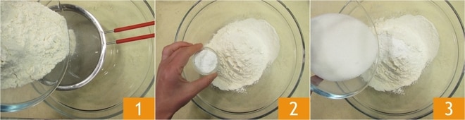 Pour préparer le gâteau aux pommes à l'eau, commencez par tamiser la farine dans un bol 1, puis ajoutez la levure 2 et le sucre 3. Mélangez les ingrédients secs avec un fouet à main.