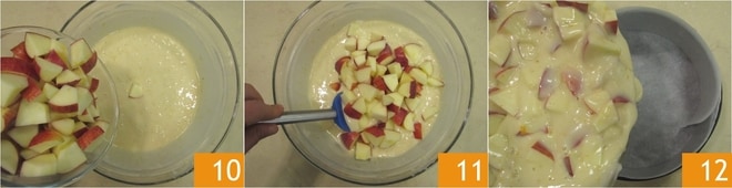 Ajoutez également les pommes en dés au mélange 10 et mélangez avec une spatule pour les incorporer uniformément 11. Versez la pâte obtenue dans un moule de 22 cm de diamètre, tapissé de papier sulfurisé 12.