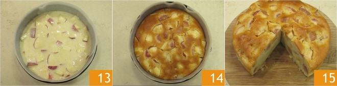 Faites cuire au four statique préchauffé à 180°C pendant environ 60 minutes, en vérifiant la cuisson avec un cure-dent 13. Une fois cuit, sortez le gâteau du four et laissez-le refroidir 14 avant de servir votre gâteau aux pommes à l'eau 15 !