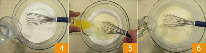 Tout en continuant à mélanger, versez progressivement l'eau 4, le jus d'orange filtré 5 et l'huile de graines 6.
