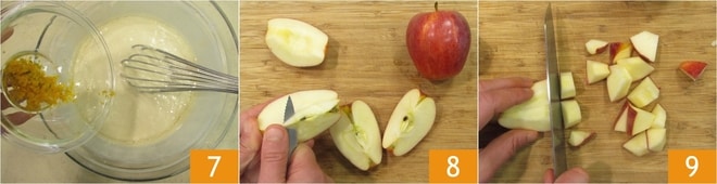 Enfin, ajoutez le zeste d'orange râpé 7 et mélangez à nouveau. À ce stade, lavez les pommes et coupez-les d'abord en quartiers 8 puis en dés irréguliers, sans les éplucher 9.