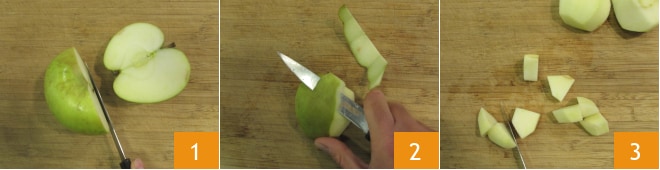 Pour préparer le gâteau aux pommes aux 4 céréales, commencez par faire fondre le beurre et laissez-le tiédir. Lavez les pommes et coupez-les en deux 1, puis retirez le trognon et la peau 2 et coupez-les en dés d'environ 2 cm 3.