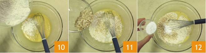 Mélangez bien, puis incorporez les 3 types de farine 10, les flocons d'avoine 11 et la levure 12.