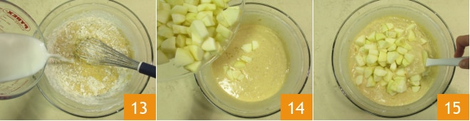 Mélangez à nouveau, puis ajoutez le lait 13 et les pommes avec tout le jus 14 et mélangez avec une spatule pour amalgamer le tout 15.