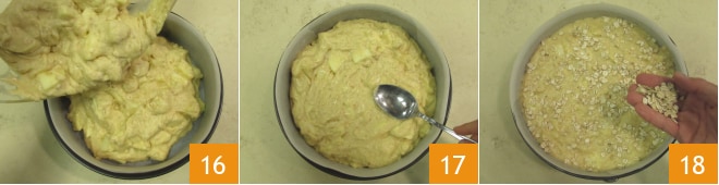 Tapissez de papier sulfurisé un moule à charnière de 24 cm de diamètre et versez la pâte à l'intérieur 16. Nivelez avec une cuillère 17 et saupoudrez la surface avec des flocons d'avoine 18.