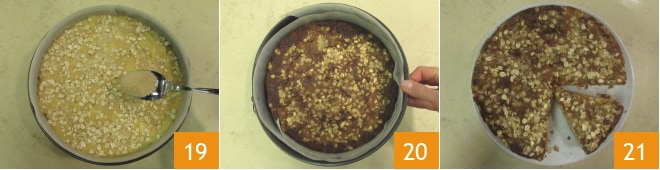 Enfin, saupoudrez de sucre de canne 19 et faites cuire dans un four statique préchauffé à 180° pendant 45 minutes, en plaçant le moule sur la grille du milieu. Une fois cuit, sortez du four et laissez tiédir 20. Votre gâteau aux pommes aux 4 céréales est prêt à être dégusté 21 !