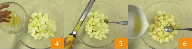 Transférez les pommes dans un bol, ajoutez le miel 4, le zeste râpé 5 et le jus de citron 6. Mélangez bien et réservez.