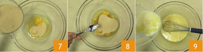 Maintenant, mettez les œufs dans un autre bol, ajoutez le sucre de canne 7 et le sel 8, fouettez avec un fouet à main, puis versez le beurre fondu 9.