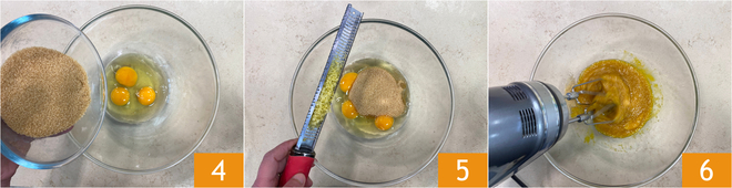 Cassez 3 œufs dans un bol, ajoutez le sucre de canne 4, une pincée de sel et le zeste de citron râpé 5. Commencez à fouetter avec un batteur électrique.