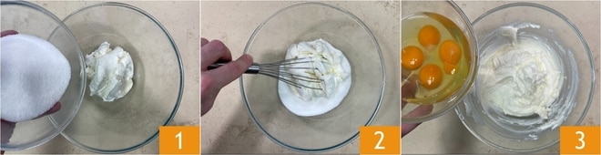 Pour réaliser le cheesecake basque, commencez par verser le fromage à tartiner et le sucre dans un grand bol 1 et mélangez bien avec un fouet manuel 2, puis ajoutez un œuf à la fois 3.