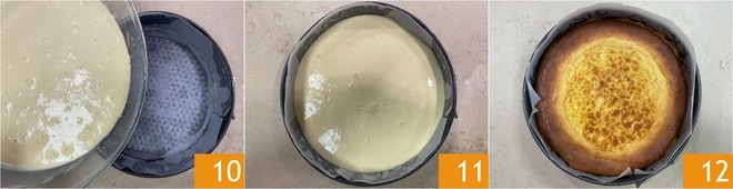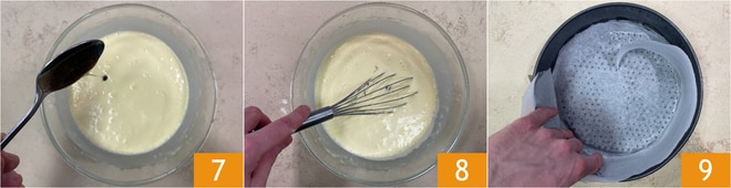 Enfin, ajoutez l'extrait de vanille 7 et incorporez-le au mélange : il doit être lisse, épais et homogène 8. Tapissez le fond et les côtés d'un moule à charnière de 22 cm de diamètre avec du papier sulfurisé 9.