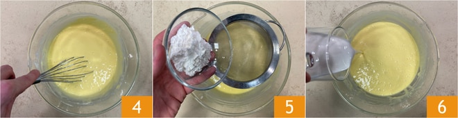 Continuez à travailler avec le fouet pour incorporer progressivement les œufs dans le mélange 4. Tamisez la fécule de maïs 5 et mélangez à nouveau, puis ajoutez également la crème 6.