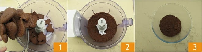 Pour préparer le gâteau biscuit sans cuisson, commencez par préparer la base. Versez les biscuits au cacao dans un mixeur 1 et mixez-les jusqu'à obtenir une poudre 2. Transférez-la dans un bol 3 et réservez.