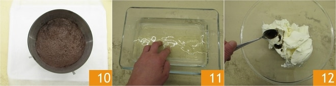 Quand vous aurez bien recouvert la base 10, transférez au réfrigérateur. Mettez maintenant la gélatine en feuilles à tremper dans de l'eau froide 11. Pendant ce temps, dans un bol, versez le fromage à tartiner et l'extrait de vanille 12.