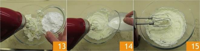 En travaillant avec un batteur électrique à basse vitesse, ajoutez également le sucre glace 13 et 100 g de crème 14. Continuez à travailler jusqu'à obtenir une crème lisse et aérée 15.