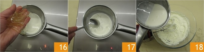 Chauffez encore 100 g de crème dans une casserole 16. Égouttez ensuite la gélatine, versez-la dans la crème chaude et mélangez jusqu'à ce qu'elle soit dissoute 18. Laissez tiédir un instant et versez-la dans le mélange de fromage 19.