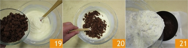 Mélangez à nouveau et quand elle sera bien absorbée, ajoutez les biscuits préalablement émiettés à la main 19. Mélangez à nouveau 20, puis transférez le mélange dans le moule avec la base de biscuits au cacao 21. Lissez bien la surface et transférez au réfrigérateur pendant au moins 4 heures.