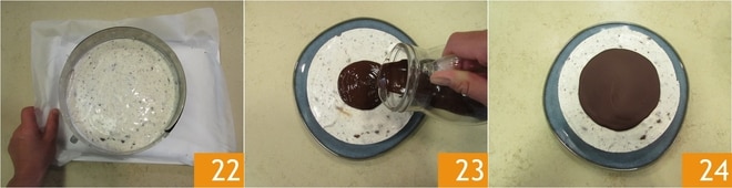 Après ce temps, faites fondre les 100 g de chocolat qui serviront pour la décoration finale. Démoulez le gâteau 22, retirez le papier acétate et placez-le sur un plat de service. Versez le chocolat au centre du gâteau, de manière à former un disque, sans le recouvrir entièrement 23. Transférez à nouveau au réfrigérateur, jusqu'à ce que le chocolat soit solidifié. Ensuite, vous pourrez le servir 24.