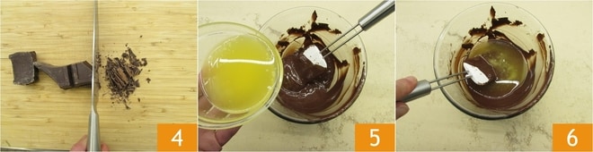 Ciselez finement le chocolat 4 et faites-le fondre au bain-marie ou au micro-ondes. Faites également fondre le beurre et versez-le dans le chocolat fondu 5. Mélangez bien avec une spatule pour homogénéiser 6.