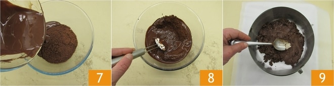 Versez le chocolat avec le beurre sur les biscuits mixés 7 et mélangez 8 jusqu'à obtenir un mélange homogène. Prenez un cercle à pâtisserie de 20 cm, placez-le sur une plaque recouverte de papier sulfurisé et insérez une bande d'acétate à l'intérieur. Versez le mélange de biscuits à l'intérieur et aplatissez-le délicatement avec le dos d'une cuillère 9.