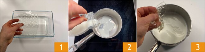 Pour préparer le gâteau bouquet de fraises, commencez par la crème pour la décoration : mettez la gélatine à tremper dans de l'eau froide pendant 10 minutes 1. Chauffez le lait jusqu'à ébullition 2, puis incorporez la gélatine bien essorée 3.