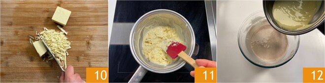 Enfin, hachez le chocolat blanc au couteau 10, faites-le fondre au bain-marie 11 et incorporez-le à la crème 12.