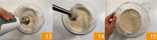 Avec un mixeur plongeant, travaillez pendant quelques minutes 13 en essayant de ne pas incorporer d'air 14, puis couvrez avec du film alimentaire au contact 15 et laissez raffermir pendant au moins 3-4 heures au réfrigérateur.