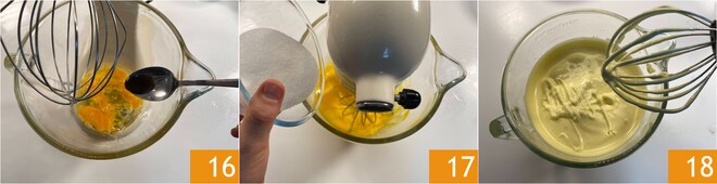 Passez à la préparation du zuccotto en commençant par le génoise : dans un robot culinaire muni d'un fouet, versez les œufs et l'extrait de vanille 16; mettez la machine en marche à vitesse modérée et ajoutez le sucre et le sel 17. Travaillez le mélange pendant 15-20 minutes, il doit être clair et mousseux 18.