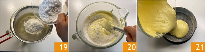 Tamisez la farine et la fécule dans la pâte à travers un tamis 19 et incorporez délicatement avec la maryse 20. Versez la pâte dans un moule de 24 cm de diamètre, beurré et fariné 21.