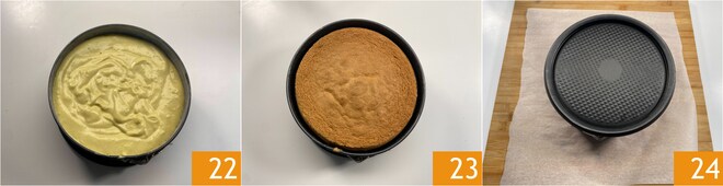 Faites cuire sur la grille inférieure du four à 160° pendant environ 50 minutes 22. Sortez le génoise du four 23 et retournez-le sur un plan avec du papier sulfurisé, puis laissez refroidir 24.