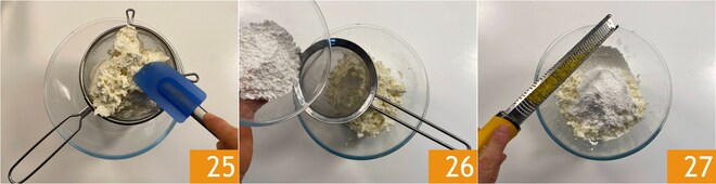 Maintenant, occupez-vous de la garniture du zuccotto : tamisez la ricotta dans un bol 25, puis ajoutez le sucre glace tamisé 26 et le zeste de citron râpé 27.