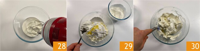 Battez la crème en suivant les indications de notre fiche : Comment monter la crème en utilisant un fouet électrique 28, puis incorporez-la à la ricotta en 2 fois 29 et mélangez pour obtenir une crème homogène 30.