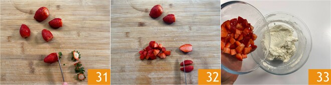 Lavez et équeutez les fraises 31, puis coupez-les en petits morceaux 32 et incorporez-les à la crème de ricotta 33.