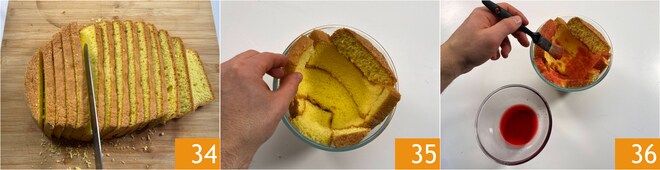 Tout est prêt pour composer le zuccotto : récupérez le génoise désormais froid, coupez-le en tranches de 1 cm d'épaisseur 34, et avec celles-ci tapissez l'intérieur d'un bol en verre de 17 cm de diamètre 35. Imbibez avec l'alchermes en badigeonnant bien toute la surface 36.