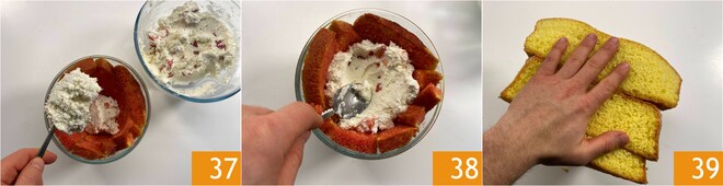 Maintenant, versez la crème de ricotta au centre 37 en pressant bien avec le dos de la cuillère 38. Recouvrez la garniture avec d'autres tranches de génoise 39.
